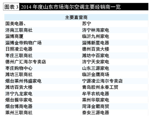 海尔在山东的主要经销商有国美电器、苏宁、济南三联商社、济宁林海家电、淄博商厦、临沂九州家电、淄博金帝购物广场、淄博新星电器、日照凌云电器、德州百货大楼、枣庄三联商社、潍坊中百家电、德州广汇海尔专卖店、济宁天安家电、枣庄购物中心、山东三源家电、潍坊三联商社、临沂金鹰商场、烟台莱州伟盛家电、宁源凌云海尔专卖店、潍坊百货大楼、青岛胶州永春工贸、济宁九龙家电、牟平农机电器、烟台振华家电、莱州华联家电、烟台博商电器、菏泽金霸商贸、莱州三联商社、聊城市百货大楼、泰安三源电器等(图表3)。