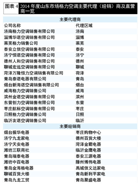 格力在山东的主要经销商有烟台振华电器、枣庄购物中心、济宁九龙家电、德州百货大楼、济宁天安电器、菏泽金霸电器、潍坊三联商社、临沂金鹰电器、青岛瑞泰电器、泰安三源电器、潍坊中百电器、滕州博伟电器、青岛金海格电器、禹城信义达家电、聊城百货大楼、青岛新利平家电、青岛九龙工贸、青岛聚盛电器等(图表4)。