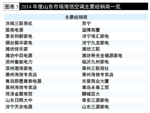 海信在山东空调市场上主要是直营,省会城市、地级市和县级市都由海信分公司直接操作,只有乡镇市场才设立代理,但代理商规模都很小。主要经销商有济南三联商社、苏宁、国美电器、淄博商厦、泰安利群家电、济宁海汇家电、烟台振华家电、济宁九龙家电、潍坊佳乐家、潍坊三联、潍坊中百电器、潍坊寿光全福源家电、滨州鲁能电力、临沂九州家电、滨州渤海家电、莱州三联商社、德州海信专卖店、莱州海信专卖店、青岛即墨雅泰电器、东营商业大厦、山东三源、莱州海信专卖店、青岛永春工贸、菏泽金霸商贸、聊城百大、山东日照大中、泰安三源家电等(图表5)。