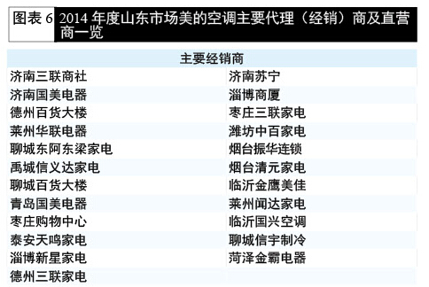 美的专卖店、专业经销商占比较大,主要布局在一二级市场,在三四级市场以县级代理商辐射乡镇以及农村市场。主要经销商有济南三联商社、济南苏宁、青岛苏宁、青岛国美电器、济南国美电器、淄博新星家电、枣庄三联家电、淄博商厦、聊城东阿东梁家电、泰安天鸣家电、聊城信宇制冷、禹城信义达家电、莱州闻达家电、临沂国兴空调、菏泽金霸电器、德州百货大楼、德州三联家电、滨州富强科贸、莱州华联电器、烟台振华连锁、潍坊中百家电、烟台清元家电、临沂金鹰美佳、聊城百货大楼、枣庄购物中心(图表6)。