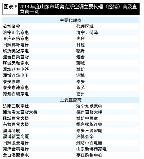奥克斯在山东的主要经销商有济南三联商社、济宁九龙家电、寿光百货大楼、德州百货大楼、聊城百货大楼、潍坊中百家电、东营百大、烟台振华连锁、淄博商厦、泰安三源家电、淄博新星商厦、淄博金帝、日照凌云电器、潍坊中百电器、菏泽金霸电器、山东新博伟家电、龙口海源家电、枣庄购物中心等(图表8)。