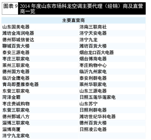 科龙在山东市场主要采用直营的销售模式,直营商有国美电器、苏宁、济南三联商社、济宁九龙、济宁天安电器、山东三源电器、潍坊金海润电器、德州郓城信誉达、烟台龙口百大电器、枣庄三联家电、潍坊世纪华科电器、德州鄄城八方、德州百货大楼、德州国方电器、泰安利群电器、济宁九龙家电、淄博商厦、聊城百货大楼、泰安三源电器、淄博三联家电、潍坊百货大楼、莱州三联家电、临沂金鹰电器、莱州华联家电、烟台博商电器、临沂九州家电、青岛即墨雅泰电器、日照凌云电器、枣庄购物中心、日照五莲华莲家电、枣庄贵诚购物、日照利群电器、东营三联家电、菏泽金霸电器等(图表9)。
