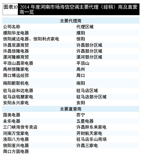 主要直营商有国美电器、永乐电器、五星电器、苏宁、三门峡海信专卖店、许昌胖东来家电、开封航天家电、洛阳八方电器、驻马店乐山商场、信阳亚兴电器、许昌三家电、周口方圆电器等(图表10)。