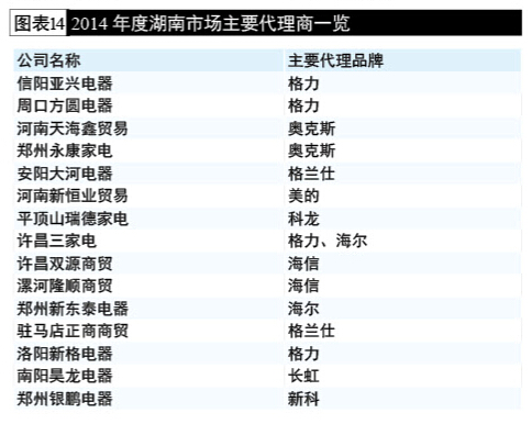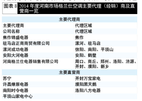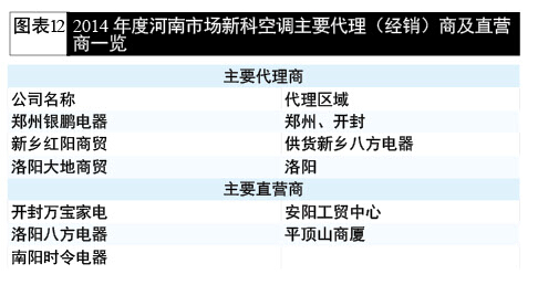 本年度主要代理商有河南天海鑫贸易代理郑州郊县,郑州昊洪电器代理开封部分地区,郑州永康家电代理安阳、鹤壁地区,清风永胜电器代理濮阳部分地区,南乐兄弟家电代理濮阳部分地区,商丘圣达电器代理商丘,南阳誉皇电器代理南阳区域,濮阳市宏达电器代理濮阳部分地区,周口西华国美电器代理周口部分区域,河南阵安电器代理平顶山,许昌宏伟电器代理许昌,洛阳君都商贸代理洛阳,郑州胜泽电器代理焦作地区,新乡博睿家电代理新乡。