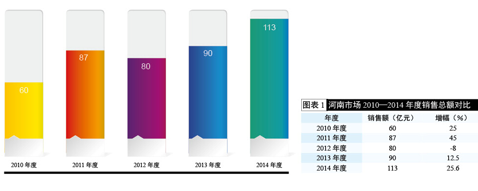 2012年度、2013年度河南市场容量分别为 80亿元、 90亿元,2014年度整体市场容量达113亿元,同比增长25.5%,增幅位于全国之首(图表1)。