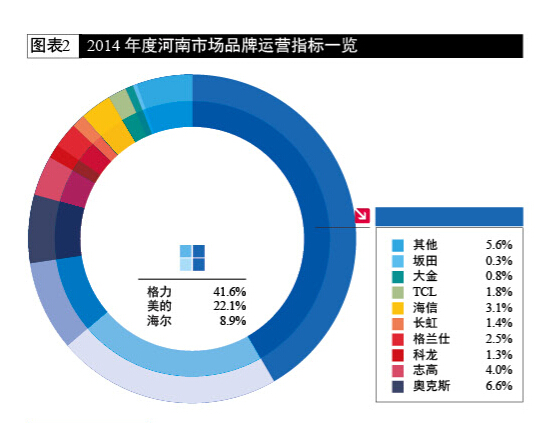 河南市场是人口大省,空调市场基数较低。本年度,空调市场刚性需求释放明显。南阳、新乡、洛阳等人口多,发展潜力大的市场,依旧是河南空调市场的重要增长点。淡旺季不明显。淡季期间,厂商活动力度大,中高端机增幅明显,各品牌同比出现较大的增幅。7月虽受天气的影响,但对本年度的影响并不大,市场上美的、奥克斯等大部分品牌都出现了较大幅度的增长。格力在河南的生产基地,产能进一步增加,对当地市场销售起到很大的拉动作用,整体销售额同比增幅明显。随着消费观念的变化,经济能力的增强,三四级市场空调开始渐渐普及,并且机型逐渐转向高效节能、外观漂亮的变频机。为了争夺三四级市场的份额,各品牌渠道深度下沉。
