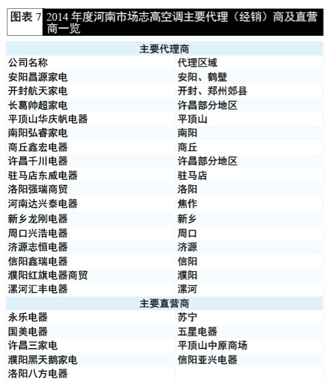 主要直营商有永乐电器、苏宁、国美电器、五星电器、许昌三家电、平顶山中原商场、濮阳黑天鹅家电、信阳亚兴电器、洛阳八方电器等(图表7)。