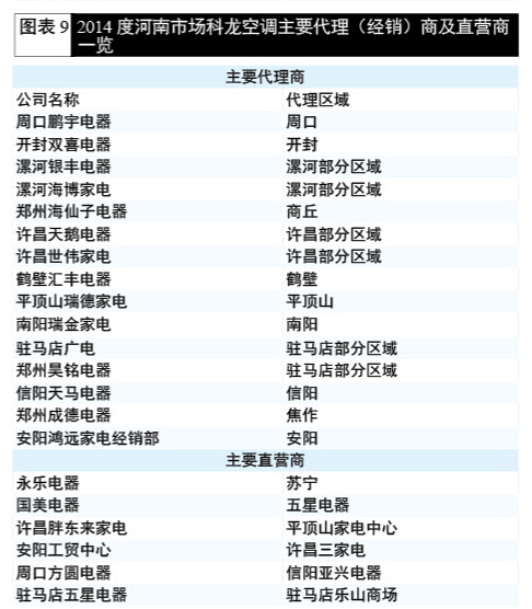 2014年度,科龙在河南由郑州和漯河2家分公司操作,经营模式为代理加直营。郑州分公司管辖开封、商丘、鹤壁、焦作、安阳、郑州、新乡、濮阳、济源、洛阳、三门峡,漯河分公司管辖漯河、驻马店、信阳、周口、许昌、南阳、平顶山。