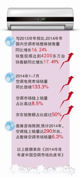 《2014年上半年家电网购分析报告》显示,空调线上零售量和零售额的同比增幅接近100%,远远高于线下。2014年,线上渠道成为家用空调零售市场仅次于独立渠道和大家电连锁渠道的第三大渠道,在整体市场中的销售占比超过8%。