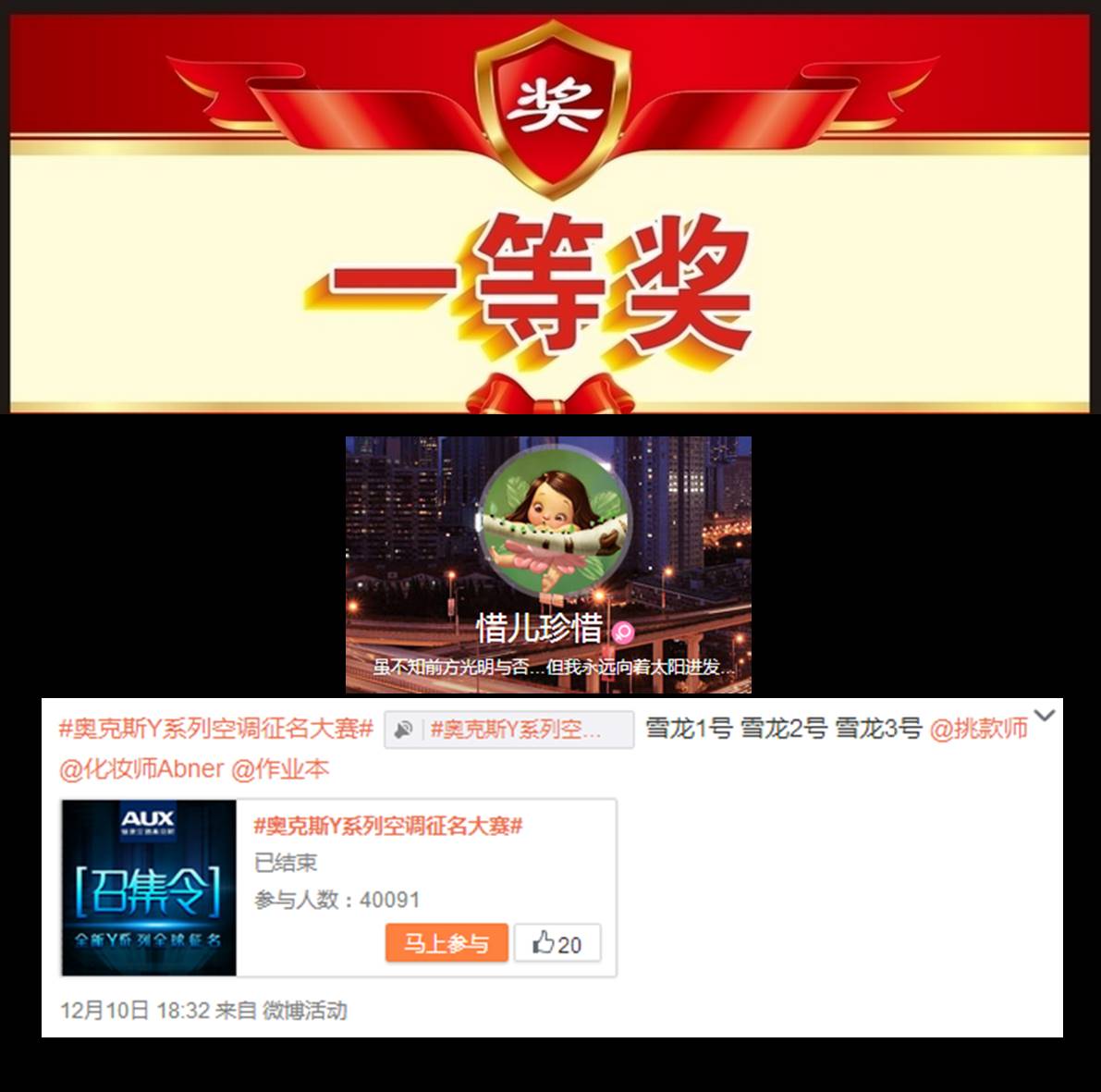 其中ID名为惜儿珍惜的参与用户以“雪龙1号、雪龙2号、雪龙3号”的神命名“力拔头筹”容获一等奖,“豪取”全新Y系列空调一套。最终Y系列产品的命名就选用此微博好友的创意,并在他创意的基础上调整为雪龙Ⅰ、雪龙Ⅱ、雪龙Ⅲ,奥克斯“雪龙系列”就此震撼问世。