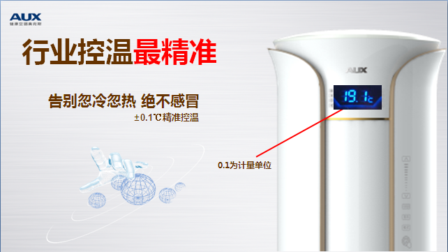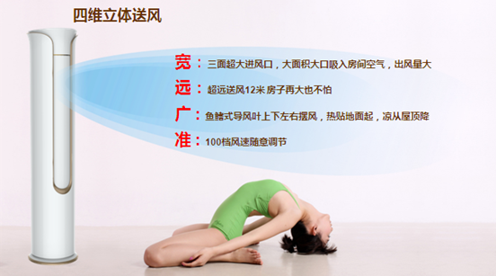 奥克斯"雪龙系列"精品柜机在送风模式上采用四维立体送风模式,140度超大角度送风,最远送风距离达12米,一举实现了“宽、远、广、准”的送风效果,再加之其±0.1℃精准控温,彻底告别吹空调“忽冷忽热”现象,堪称行业目前上送风效果最好的空调;