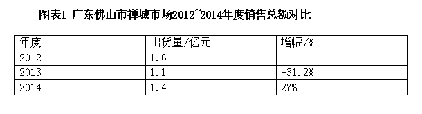 禅城区是广东佛山市的五个行政辖区之一。位于广东省中部,毗邻广州市、深圳市等珠江三角州多个重要城市,同时也是佛山市政府所在地,因此,虽然其面积相对于其他4个辖区相对较小,但是凭借其发达的商业、娱乐业、制造业,依旧成为了几个辖区中经济发展最迅速的一个。2014冷年,得益于广东整体经济的复苏,尤其是房地产等行业的复苏,极大的拉大了消费者的刚性需求,因此,空调销售情况较为理想,同时,高温的天气也为空调销售创造了较理想的销售条件,因此,2014年度禅城地区的销售额为1.4亿元,同比去年增幅 27% 。(图表1)。