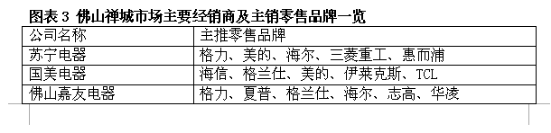 越丰电器代理志高禅城、三水、高明区域,2014年度销售额约为1400万元左右,佛山嘉友电器有限公司主要代理格力空调大佛山区域,同时下设建新和升平两个大型空调零售商场。顺博电器负责松下大佛山区域,2014年度销售为2亿元(图表3)。