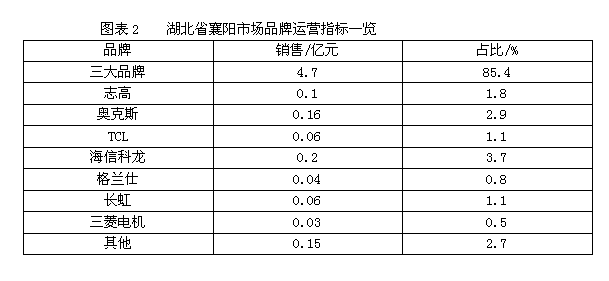 作为湖北省第二大城市,襄阳市常住人口约560万人,其发达的经济条件为空调市场的逐年增长创造了有利的环境。三大品牌在襄阳市场中所占份额超过85%,其2014年度的空调销售总额约为5.5亿元,同比2013年度增长10%(图表1、2)。