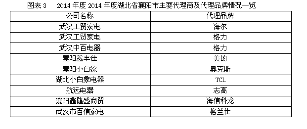 襄阳地区格兰仕空调由武汉营销中心负责。其主要代理商为武汉市百信家电有限公司,主要直营商有襄阳市仕佳机电、苏宁、国美电器等,销售额约为400万元。大金在襄阳市场由湖北武汉办事处负责销售,其主要代理商有武汉美拓贸易发展有限公司,主要的经销商有武汉工贸、国美电器、苏宁等,大金的自营专卖渠道也是其销售的主要组成部分(图表3)。