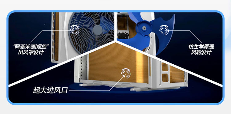 行业独家室外机,噪音低。机身正面无螺钉,顶盖T字型结构,有效确保机内稳定,减少震动噪音,“阿基米德螺旋”出风罩+仿生学风轮,有效减少风力受阻的声音。