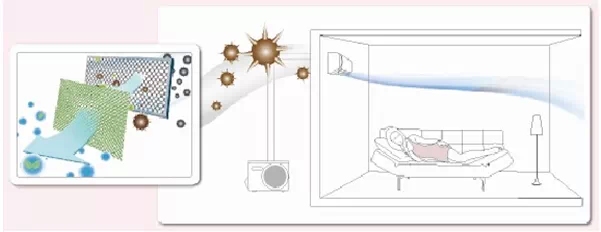 悦世V智(086BP)采用高密度除尘过滤网:净化空气中的细小灰尘;采用可清洁光触媒除臭过滤网:净化空气中的有害气体,杀菌除异味。