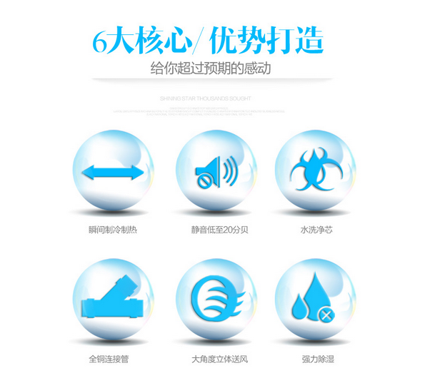大角度立体送风,可实现88度上下大角度立体送风,均匀感受丝丝凉风。水洗净芯,通过对机体内部水封的冷凝和速热,强力分解污垢。强力除湿功能,一键启动除湿模式,告别夏日黏腻,干爽怡人。