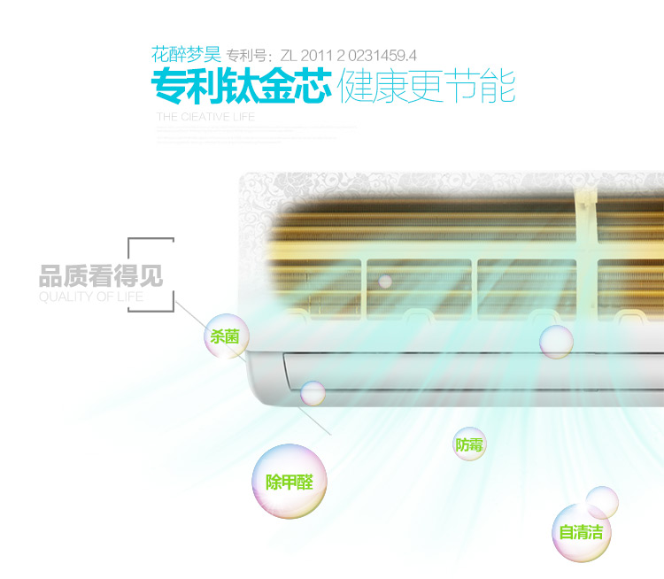 花醉系列空调专利钛金芯,健康更节能。隐藏式LED屏显,独特印花尽显奢华。知名设计师设计,将传统图案与现代科技完美结合,将电器融入到魅力品质的生活中,尽显高贵。