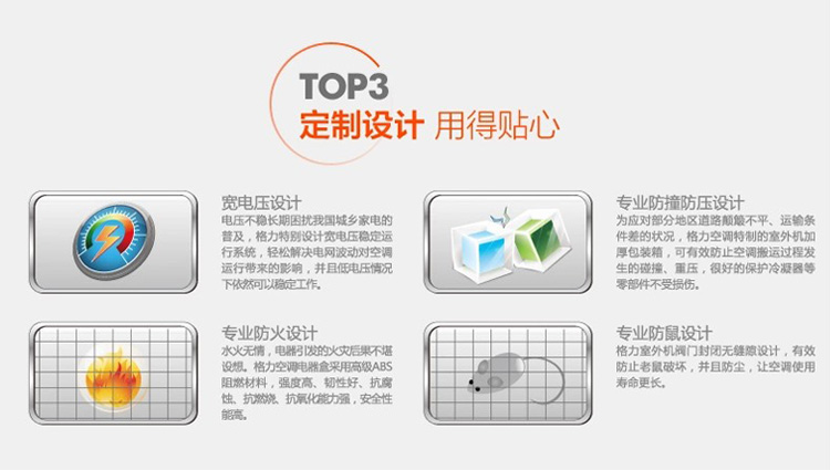 在设计上,格力KFR-26GW/(26596)FNAa-A3 壁挂式Q铂变频冷暖空调采用宽电压设计,轻松解决电网波动对空调运行带来的影响,并且低电压情况下依然可以稳定工作。格力空调电器盒采用高级ABS阻燃材料,强度高、韧性好、抗腐蚀、抗燃烧、抗氧化能力强,安全性能高。格力室外机阀门封闭无缝隙设计,有效防止老鼠破坏,并且防尘,让空调使用寿命更长。