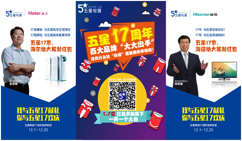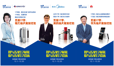 在他们看来,五星电器更像是一个被赋予情感的低调而稳重的“人”,一个可以信任,可以牵手走过的伙伴,五星电器每一次改变,都扎实稳打的前行着,获得了很多常年合作品牌伙伴的信任与支持。在五星电器17周年来临之际,一众供应商都十分支持,并推出累计1.7亿元的品牌红包让利促销。另据悉,12月是五星电器17周年司庆月,除了品牌家电齐让利外,五星还特别推出感恩活动,170元红包任意送,会员积分兑换通用流量和电影票,95折大众点评卡提前抢,0元克莉丝汀蛋糕免费吃……五星电器的做法不像是一个平常的公司庆生,而是发展成为大众狂欢节日。一应消费者所需是五星电器坚持不屑的追求。