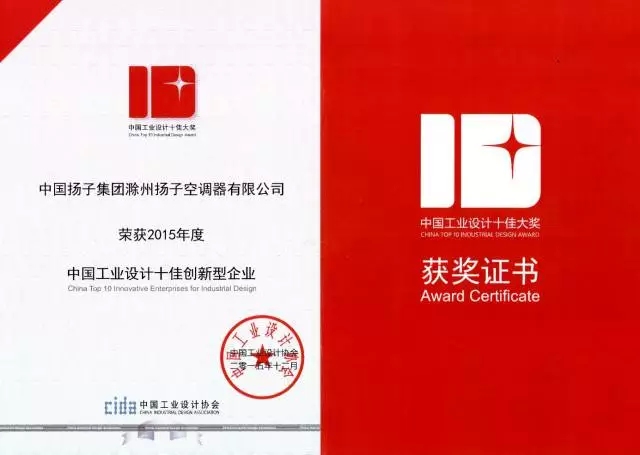 工信部原党组成员、总工程师朱宏任、中国工业设计协会原会长朱焘、中国工业设计协会会长刘宁、清华大学美术学院教授柳冠中、深圳市设计联合会会长任克雷、深圳市设计联合会常务副会长兼秘书长刘振等出席获奖发布会并为获奖者颁奖,扬子空调凭借时尚、艺术、科技感十足的悦世酷睿系列圆柱柜机荣获“2015年度中国工业设计十佳创新型企业”,公司总裁牛斌代表企业被授予了此项殊荣。