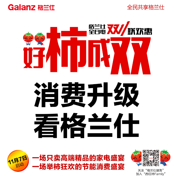 2015年11月7日,格兰仕双11让亿万西红柿“好柿成双”,为了让柿粉们不被花式虐狗,想出“好柿友优惠购”活动来,柿君也是蛮拼的。