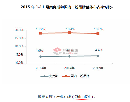 2015年1-11月奥克斯和国内二线品牌整体市占率对比