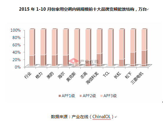 2015年1-10月份家用空调内销规模前十大品牌变频能效结构,万台