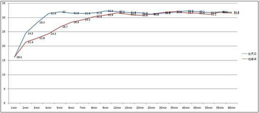 蓝色为出风口温度 红色为边缘点温度