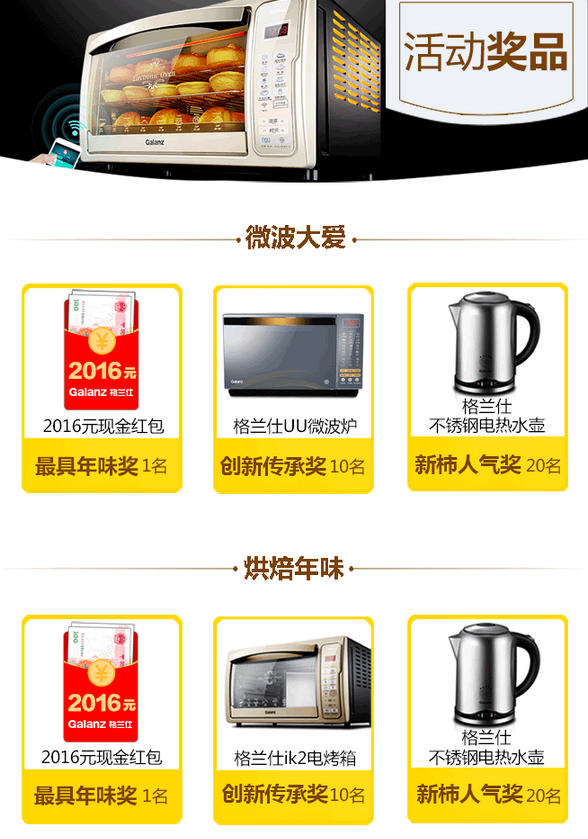 此次晒年夜饭活动,格兰仕不仅为网友铺设了展示厨艺、传播幸福的渠道,还为获奖者提供丰富礼品,包括2016元现金大红包、格兰仕uu微波炉、格兰仕ik2电烤箱、格兰仕不锈钢电热水壶,都是格兰仕旗下的高端明星产品。