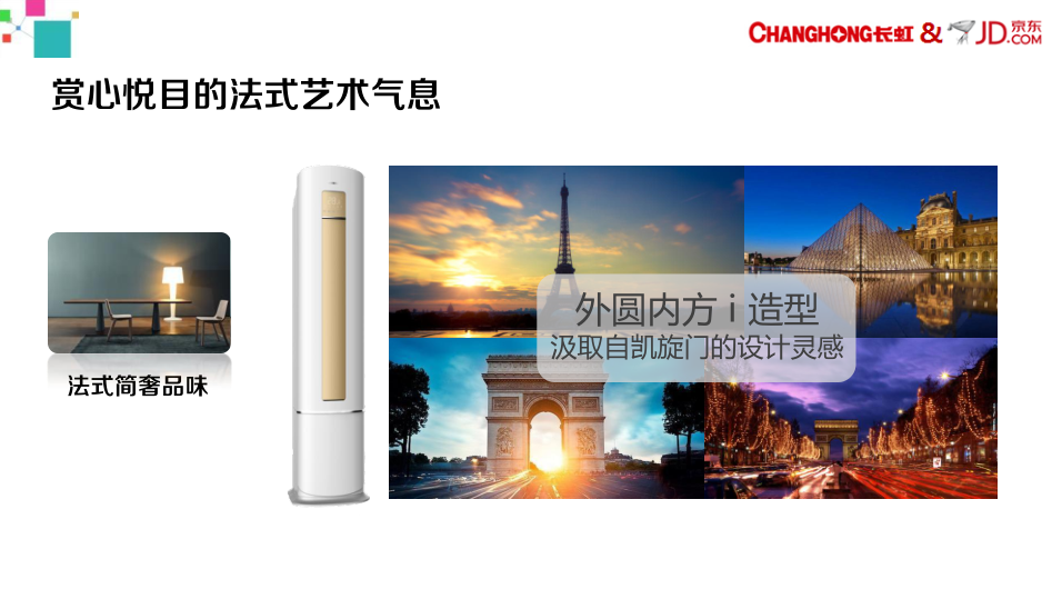 长虹“凯旋门”法式一级节能柜机独具外圆内方的“i”字创新艺术设计,主创设计师Alice小姐来自于意大利,其设计灵感来源于多年前游历法国看到凯旋门时的感触。“凯旋门”空调的设计,正如矗立在法国戴高乐广场中央的凯旋门一样,雄浑又不失精致,大气又不失轻盈,完美诠释了新古典主义的曼妙精髓。在细节设计上,该产品具备110fa_cms_addonnews*65fa_cms_addonnews的隐藏式触摸液晶屏, 975fa_cms_addonnews*130fa_cms_addonnews的出风口,整体采用了黄金比例机身分割,外观更和谐。同时,整机1800fa_cms_addonnews*375fa_cms_addonnews的机身黄金宽度比例,有效节省25%室内空间,缔造小而美的精致生活!