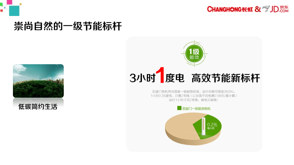 长虹“凯旋门”法式一级节能柜机倡导一种低碳环保的简约生活理念,致力于为用户营造一种环保节能的生活新体验。“凯旋门”2P一级能效柜机,能效比高达4.21,最低功耗仅为350W,相当于3个小时才要1度电,缔造节能新标杆。3P柜机能效比高达3.5,与其他品牌的2级能效相比,同等能效下,长虹空调还能再省电12%。长虹“凯旋门”柜机采用了定制高效节能压缩机、直流电机、电子膨胀阀、交叉双瘦高齿全铜管等核心部件,确保了产品性能更稳定,能效更高。