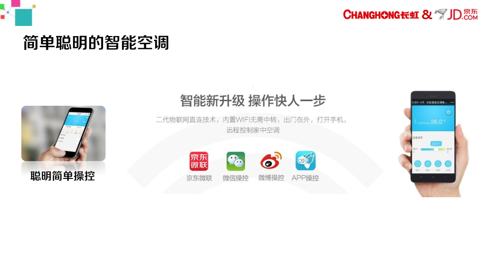 长虹“凯旋门”法式一级节能柜机配备了多种智能操控模式,,可以通过京东微联App、微博、微信、APP远程操控,内置WIFI无需中转,联网更精准更快捷。无论你在海外,还是在国内任何一个地方,都可以实现远程控制,提前预约理想空气!除此之外,还可以实现设备间的联动,与家里的其他智能设备互联互通,例如晚上关灯时,空凋就可以进入睡眠模式;在空调达到一定的温度时,家中的加湿器可以自动打开;当你离开家锁上智能锁时,空调可以自动关闭等等。