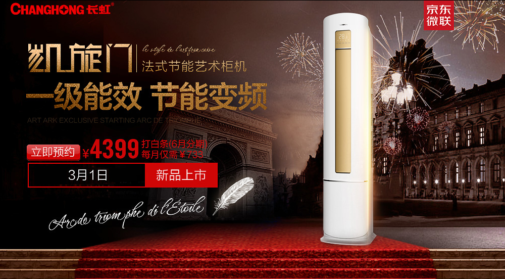 2月25日,在位于北京中关村的JD+智能奶茶馆举办了一场“邂逅·简风尚—长虹凯旋门法式一级节能柜机京东首发会”。在该发布会上,长虹空调与京东共同推出了一款名为“凯旋门”的全球首款法式一级节能柜机。该柜机是为长虹与京东共同征战2016年国内艺术柜机市场所打造的一款极致配置的性价比之王,在引领行业“简风尚”的同时,也将成为引爆2016年国内艺术柜机市场的一级节能新标杆。
