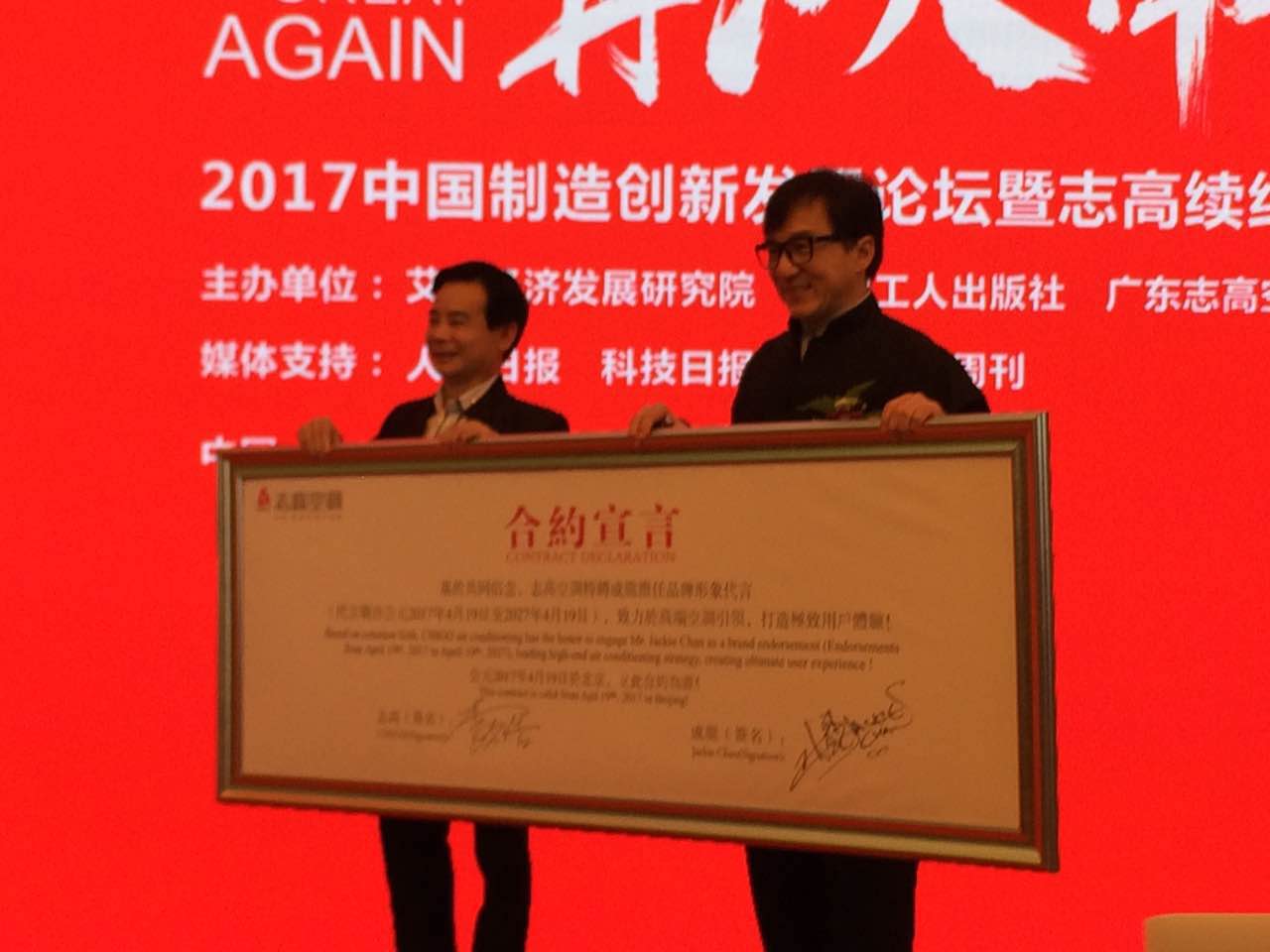 4月19日,以“让中国制造再次伟大”为主题的2017中国制造创新发展论坛暨志高续约成龙仪式在北京人民大会堂举行。志高与国际巨星成龙共同对外宣布:签署新一期品牌代言协议,双方将锁定未来10年的合作,站在世界的大舞台上,共同成就志高世界级企业的目标。这意味着,志高空调在完成智能化、高端化战略布局后正在拉开从中国制造向高端制造、从产品出口向品牌出海的全球化变革新序幕。