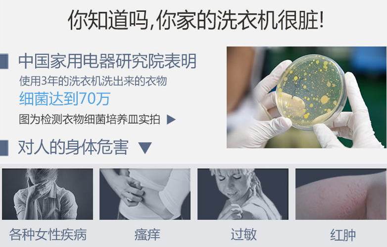 经研究发现,洗衣机内部的污垢病菌,其中包含大量的霉菌、大肠杆菌等一般致病菌是皮肤性疾病,妇科疾病等病症的隐患,长期不注意就有可能患上此类病症;以及绿脓杆菌、隐球菌等致病菌易对皮肤破损、伤口等造成感染或化脓性病变等危害;更为重要的是长期的金属污染会通过皮肤渗透易形成皮下组织病症隐患或皮肤病!这些致病菌不仅有可能引发皮肤疾病、妇科疾病,还会对皮肤破损、伤口造成感染或化脓性病变等危害。