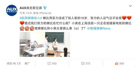 据工作人员爆料,欧阳娜娜新戏将再次牵手知名空调品牌奥克斯,二者联袂演绎,具体内容还不便透露,请持续关注奥克斯官方微信、微博。