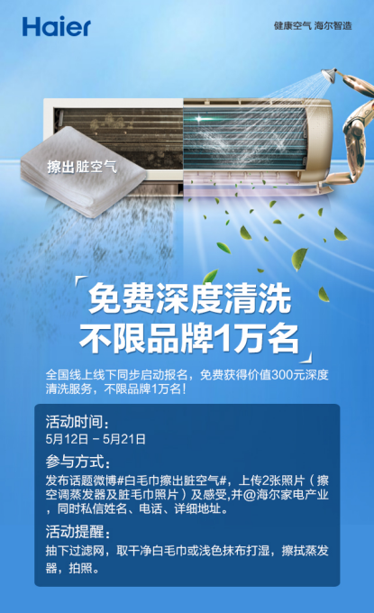 5月12日,海尔空调在全国线上线下发起#白毛巾擦出脏空气#交互活动,普及脏空调危害和健康空气的意识。活动期间,用户只要晒出白毛巾擦空调蒸发器变黑的照片,即可获得免费深度清洗蒸发器的名额,全国不限品牌1万名。这是继今年4月,空调吹白毛巾在全国近5000家卖场交互演示之后,海尔向全国用户发起的大型交互活动。
