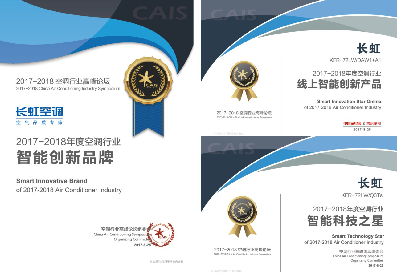 长虹空调凭借多年来在智能领域积淀的优势,继续领跑智能空调市场,独揽四项大奖,不仅唯一荣膺2017-2018年度空调行业智能创新品牌,还将线上及线下智能创新产品奖收入囊中,成为智能空调领域最大赢家。