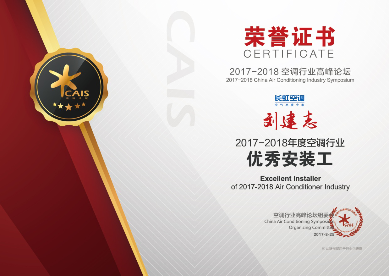 同时,用心诠释长虹空调服务精神的服务工程师刘建志荣膺2017-2018年度空调行业优秀安装工光荣称号。