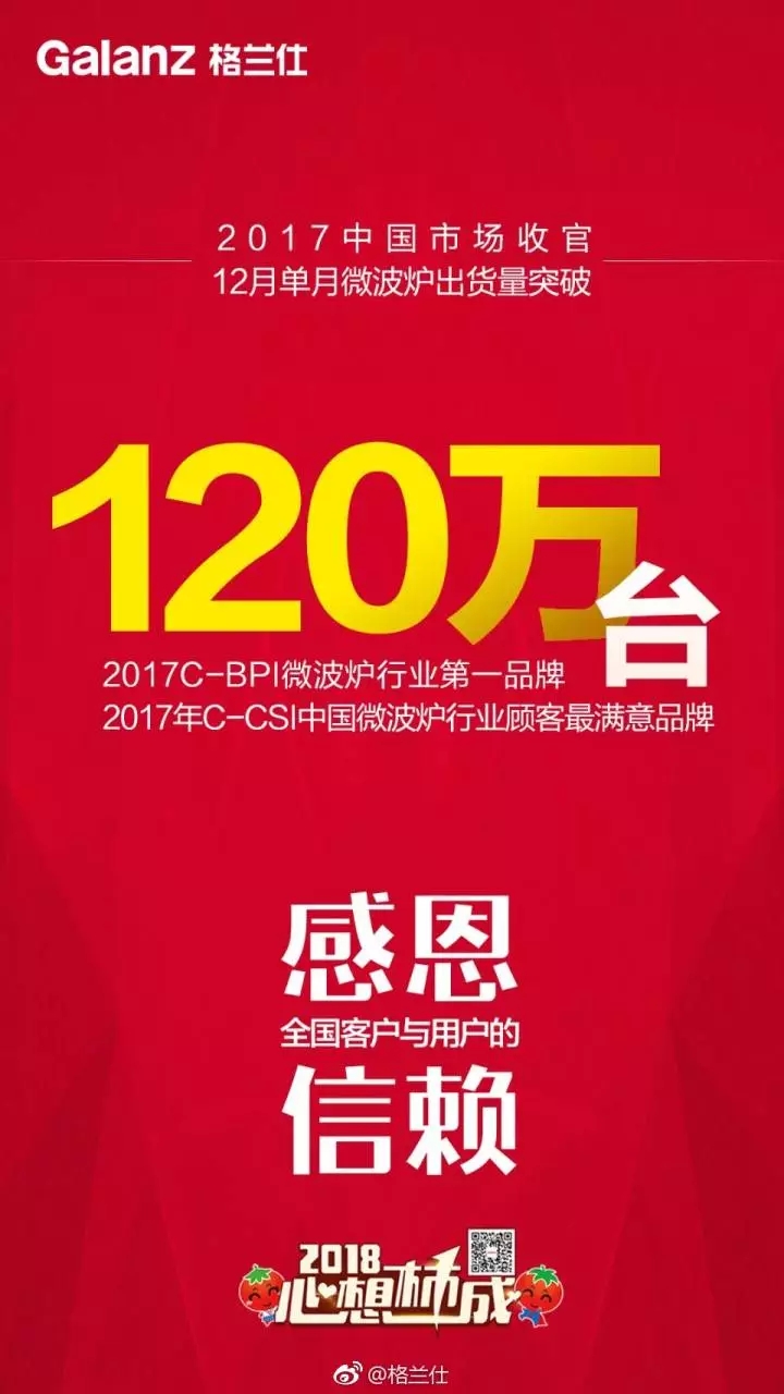 也是在这个大方向的激励下,格兰仕2017努力奋斗,交出了好成绩。不但在年末成为首批大国品牌,在刚刚过去的2017年12月,格兰仕在中国市场以单月120万微波炉出货量,完美收官。