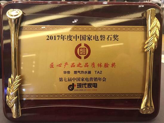 磐石奖是历届中国家电营销年会的重要奖项,自创立以来,以其专业权威、公正、客观的属性在家电行业影响广泛。华帝此次获“品质体验奖”的燃气热水器TA2,除了继承华帝25年专业燃烧技术之外,有了更多领先行业的创新。如通过环流预热功能,真正实现即开即热;通过专利温控仓,保证全时恒温无冷水。其一键恒温洗浴的快感,让产品一上市就受市场热捧。