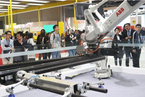 参观者在观摩ABB集团的工业机器人展区