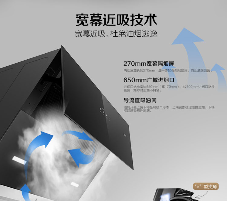 其工作原理就是,当你在烹饪的时候,270mm的宽幕隔烟屏,以及650mm广域进烟口,会加速鲸吞油烟,而且还拥有强劲的吸排性能,可避免油烟和人体接触,常规大风量—17m³/min,爆炒风量—19m³/min,最大静压—390Pa,因此也就不存在油烟袭面等困扰。
