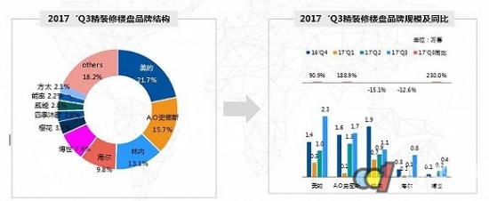房地产精装修市场所配套的品牌集中度较高,研究显示,2017年三季度TOP5品牌为美的、AO史密斯、林内、海尔、博世,其占比高达68.1%。内资品牌中美的表现较为好,而外资品牌中A.O史密斯、博世表现强劲,博世在第三季度表现尤为突出。