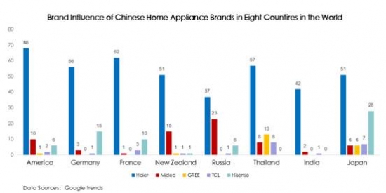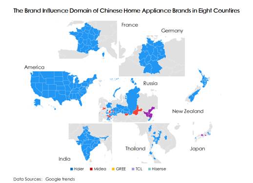 作为最早一批走出国门的中国企业,部分家电品牌见证了从“中国制造”到“中国品牌”的成长历程。去年,全球领先的数据、洞察和咨询公司凯度华通明略发布的“中国国家形象全球调查”研究显示,在家电品牌中,海尔在海外用户中熟悉程度最高,从Google Trends反映出的8大国家“蓝色版图”中可见一斑,海信、TCL、美的紧随其后。