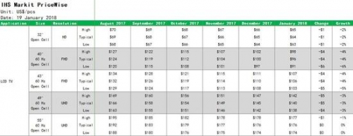 32吋面板和55吋面板价格的下降幅度比较温和,只有1%-2%之间,因为1月的市场需求依旧十分强劲。据IHS透露,某些面板制造商想对32吋面板和55吋面板进行提价,但从目前的价格来看,提价的意愿显然没有达成。
