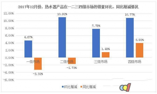 数据显示,2017年12月份,热水器市场的整体零售量和零售额分别环比增长了7.69%和5.62%,且不论零售量和零售额,均创下了年内最高的销售记录。分区域来看,一级市场的价格战打得最为猛烈,零售量环比上涨4.67%,而零售额却仅有0.98%的轻微涨幅。