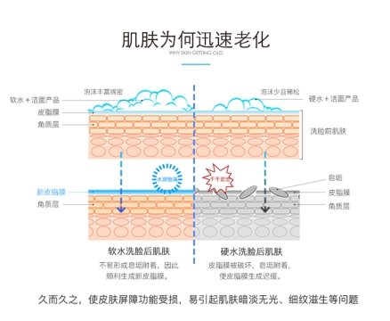 正常来说,我们家中自来水管中接出的水都是硬水,水中的钙镁离子易与洗脸皂和洗面奶中的皂基发生作用,产生皂垢残留,这些皂垢残留会像小石子一样牢牢黏在皮肤上,并不断摩擦,导致皮脂膜无法正常再生,角质层也会被破坏,从而降低护肤品的吸收能力。不仅如此,这些皂垢残留不但堵塞了皮肤的排泄通道,形成栓塞,刺激皮肤,还会影响皮肤的正常代谢,使皮肤过早地萎缩、老化。所以我们在洗完脸之后经常有这样的感觉,那就是紧绷、干燥、脱皮,在秋冬季节尤为明显,一旦没有运用补水保湿产品,接下来一整天皮肤都会十分不适。虽然夏天油脂分泌比较旺盛,感受不太明显,但是实际上伤害已经在潜移默化间造成了,无论后期用护肤品如何弥补,效果都是不尽如人意的,这就是硬水洗脸的坏处。